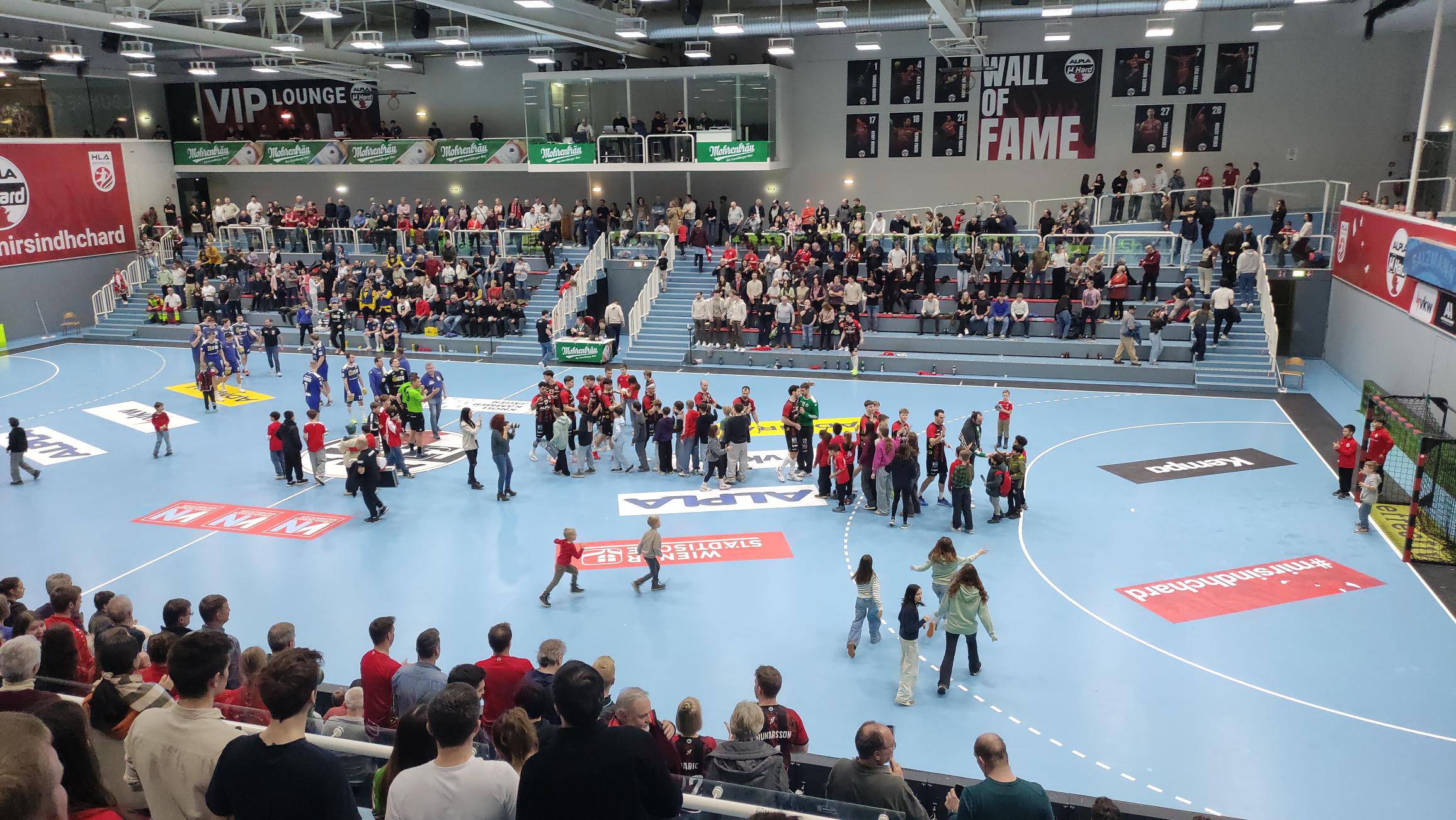 Nach dem Spiel durften die Kinder sogar aufs Spielfeld. Dort holten sie sich Autogramme und Fotos von den Spielern des HC Hard. Die Profis nahmen sich viel Zeit für die begeisterten Schülerinnen und Schüler, beantworteten Fragen, posierten für Fotos und sorgten für strahlende Gesichter.